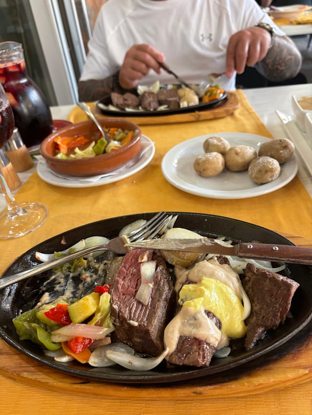 9.5/104 of us enjoyed a meal here last night. 2 had curry with rice & chips, ample amount for 1 of them, the other said there wasn't quite enough curry. My husband had chicken in pepper sauce, he thought more than enough chicken. I had grilled tuna with fried garlic potatoes. We had a litre of sangria between 3 of us plus a pint of beer. Total bill was £74. Have been here before and definitely recommend it. Great food & staff.