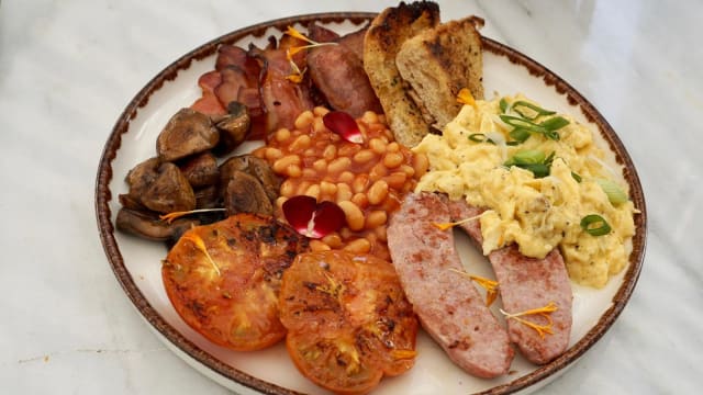 Muffin tostado, espinacas salteadas con sultanas, espárragos, huevos escalfados, salsa holandesa. Servido con boniato o ensalada.