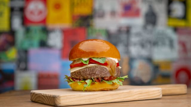 Carne de vaca, queijo mozzarella, cogumelos marron fumados com cebola branca e molho HBG