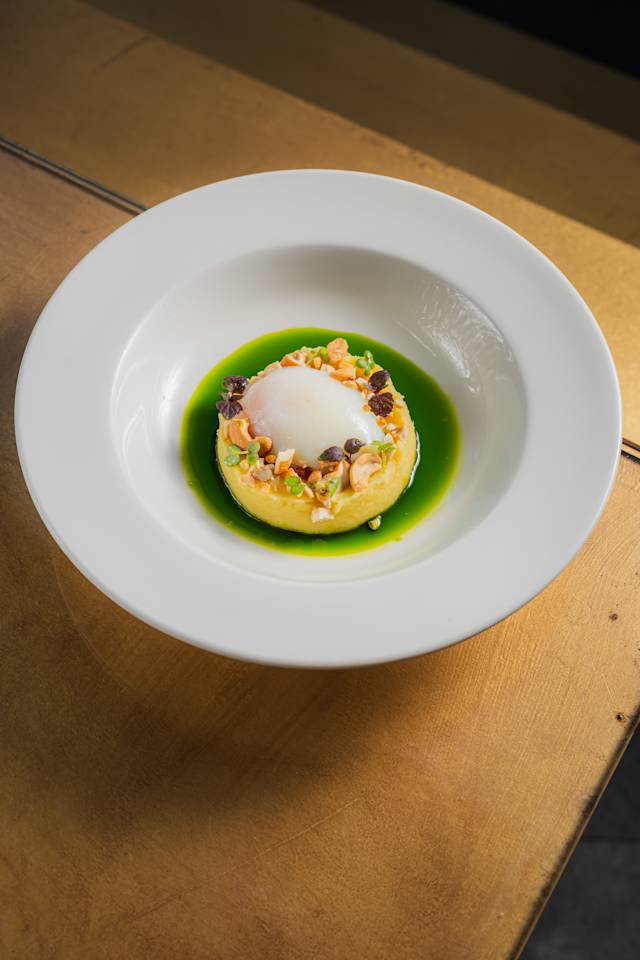 - Con crema di patate affumicate, composta di mele cotogne e anacardi