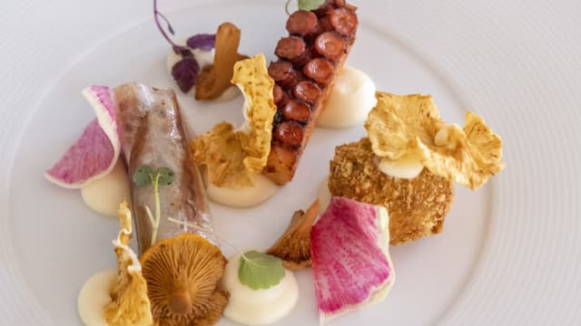 Poulpe de roche grillé, purée de mais et une salsa méditerranéen