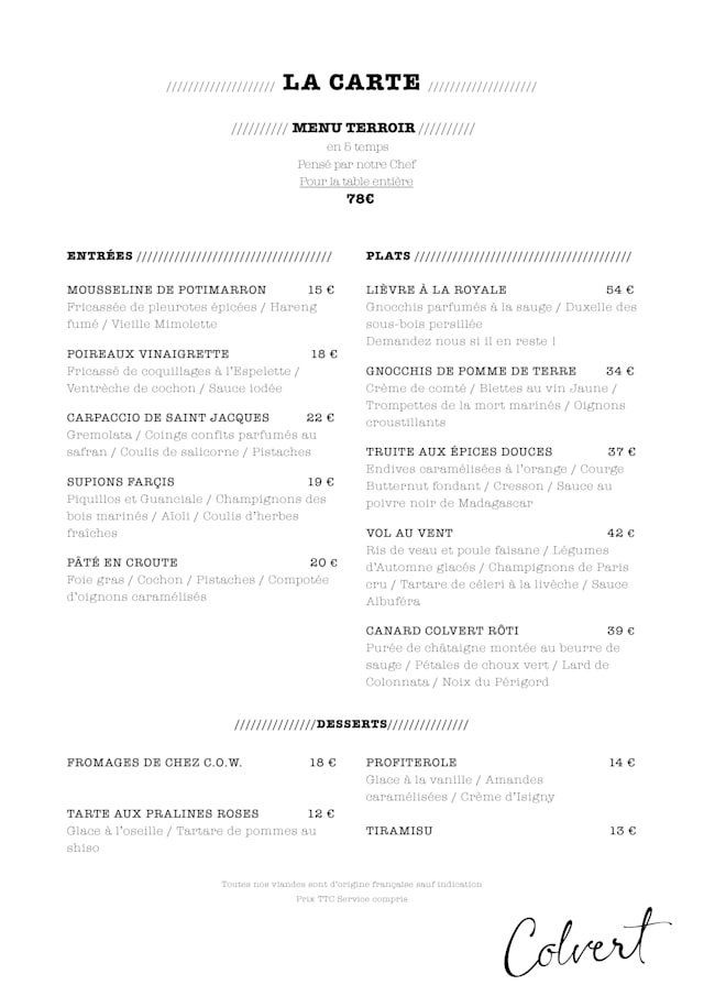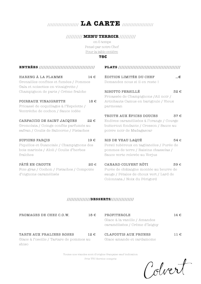 Dear Rachel, Thank you for taking the time to leave a review. We’re sorry to hear that your experience wasn’t what you expected. The menu you can see on our website has always included several options (currently four starters and five mains) and it’s always kept fully up to date. We hope you might give us another try to discover more of what the kitchen has to offer. Kind regards, L’équipe de Colvert