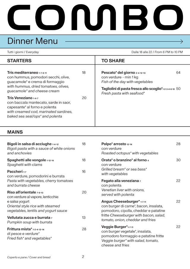 Join us at Combo Venezia for breakfast, brunch, lunch, aperitivo and everything in between. Eat outside in our breezy cloister, or inside in our fancy restaurant, order some cicchetti at our bacaro, share some street food during our live DJ sets, or simply enjoy a Southside cocktail with a private c...