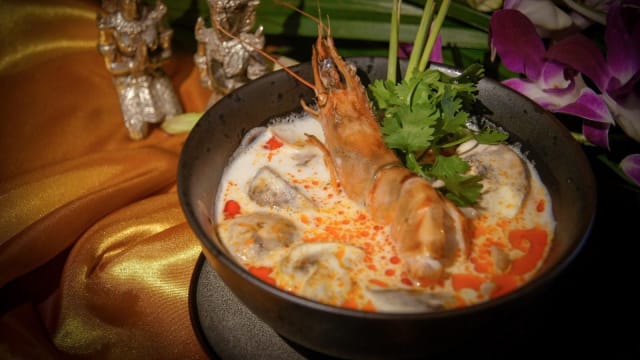 Milde soep met kokosmelk, champignons, kruiden en garnalen
