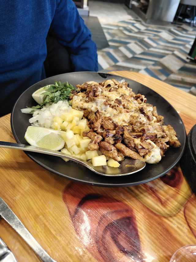 - Nachos con queso fundido, frijoles, guacamole y carnitas