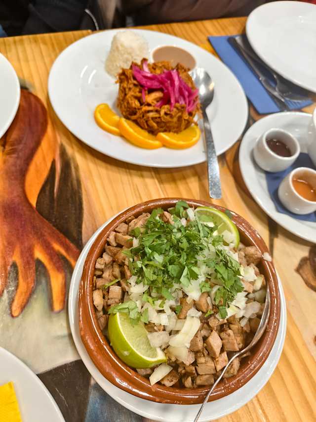 - Cerdo adobado con chile seco, piña, cilantro y cebolla