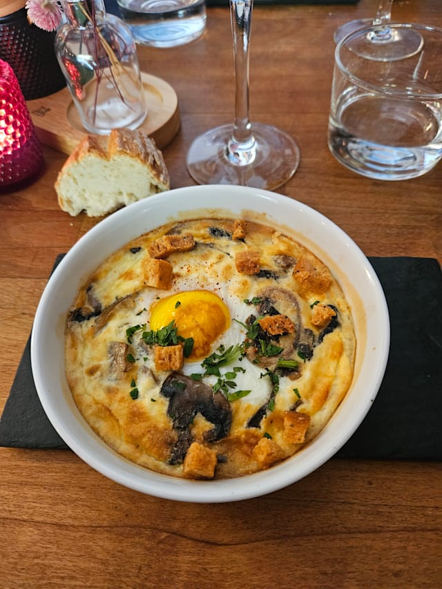 Organic eggs from the ferme du pré in oise at Eragny sur Epte . Free-range and large-caliber. Crème d'isigny ( AOC ) , button mushrooms from " La légumière " in Kleder in Brittany and sheep's feet( mushrooms) . Homemade bread croutons with olive oil and chopped tarragon.