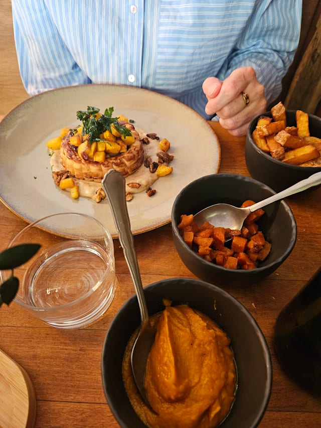 Double-fried homemade fries, Oven-roasted carrots with red onion, smoked paprika and olive oil, Pumpkin and squash puree with garden rosemary.