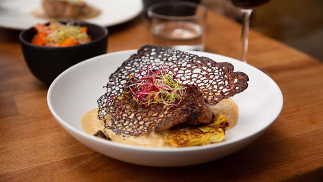 Skipjack from our coasts and belvindière duck, fallot mustard, parsley and red onion. Served with deglazed multicolored baby carrots, chestnut flour blinis, fennel pickles and candied spring onions.