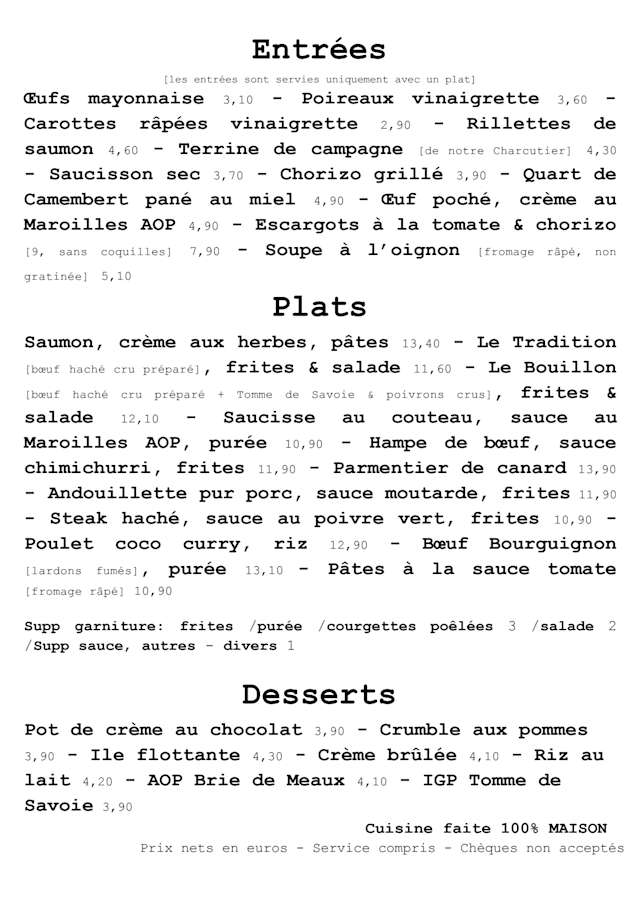 10/10The ambient is very cute and cozy. The service was fast and extremely friendly and kind. The food was traditionally french, very tasty. The portion and prices are fair and affordable. I recommend this place a lot if you want to eat good traditional food in Paris :))