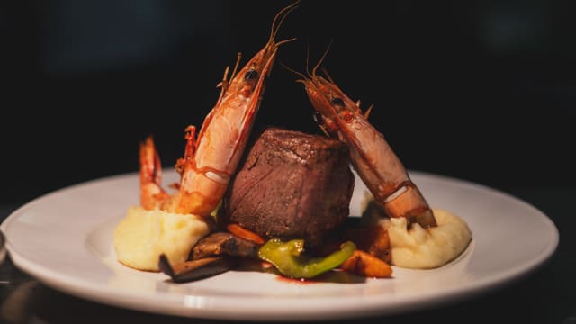 - "Surf n' turf" - corte de bife do lombo acompanhado com gambas ao alho e puré de batata trufado