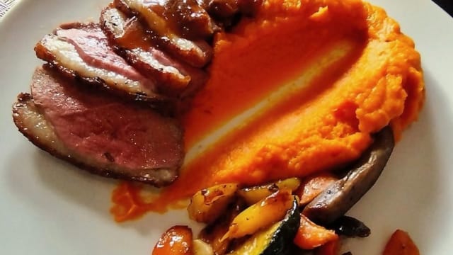 - Magret de pato com puré de cenoura e maçã 'granny smith' em molho de foi gras