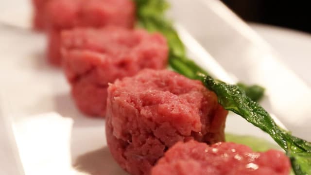 Tartare di razza fassona piemontese (150gr). Servita abbinata a senape, capperi, acciughe