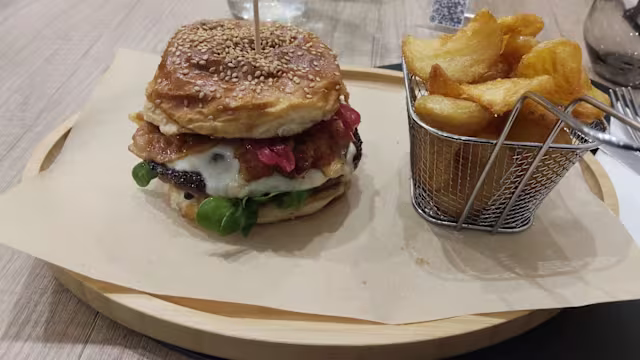 - Bun, burger di manzo, cheddar, bacon croccante, salsa composto