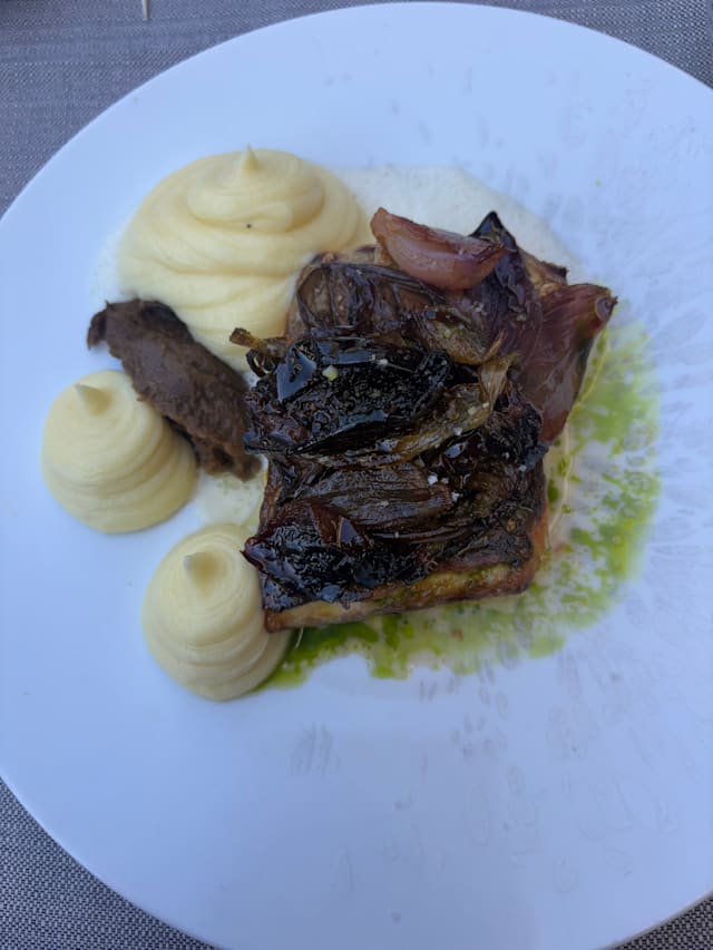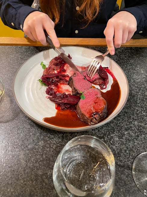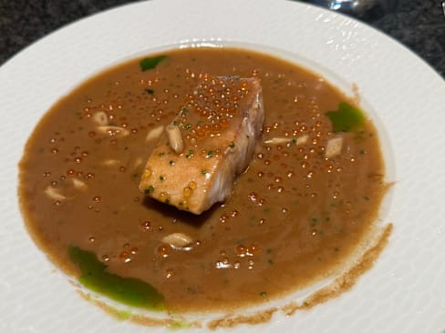 5/10A lovely welcome. The starter (carpaccio of trout) was well presented, innovative and tasted good. The main courses were both poor. Badly balanced and in my case, impossible to eat. I had fresh water fish with trout eggs. In reality it was a piece of fish floating in a beige sauce with little orange eggs bobbing about. It didn’t look great! However, the fish was well cooked and tasty. Sadly, I had no way of eating the sauce with a fork! There were no vegetables on the plate. It did come with a side salad which was unpalatably salty. My husband had steak in a raspberry sauce. It was in fact, just steak in a tiny bit of jus. Nothing else. The restaurant caters for large groups . The ambience and service were what I would expect if I was on a coach tour. We have eaten in several Michelin recommended restaurants during our time in France, this restaurant was not one that I’d recommend yet it was the most expensive.