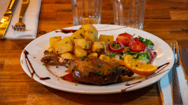 - Salade, chèvres toastés, croûtons, tomates, noix, miel