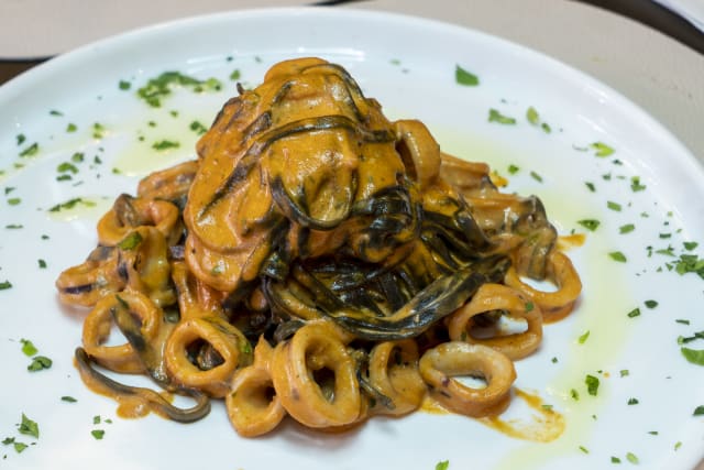 Nel 1983 con questo piatto conca d’oro vinse “the international european food contest”. Tagliolini neri di pasta fresca conditi con una salsa a base di anelli di calamari, crema di latte, pomodoro, aglio, olio evo e prezzemolo. Provali, accenderanno le tue papille gustative.