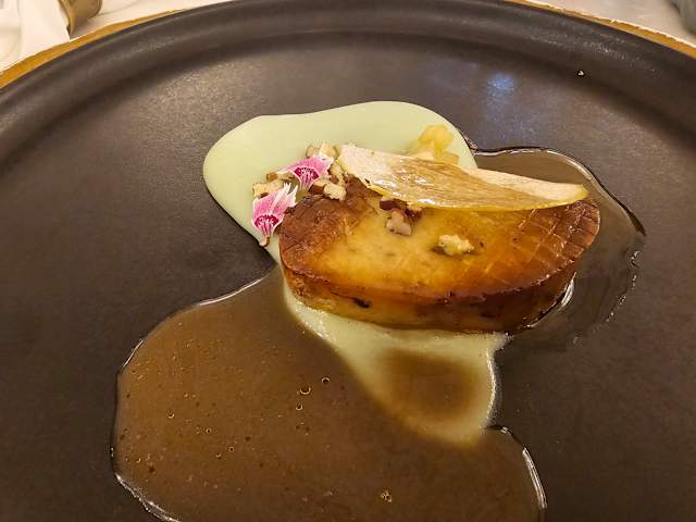 - Foie gras, puré de maçã verde, brunesa de maçã verde glaceada com mel e vinagre de sidra, salada de rebentos, crocante de maçã verde, crumble de noz pecan e jus de vinho do Porto