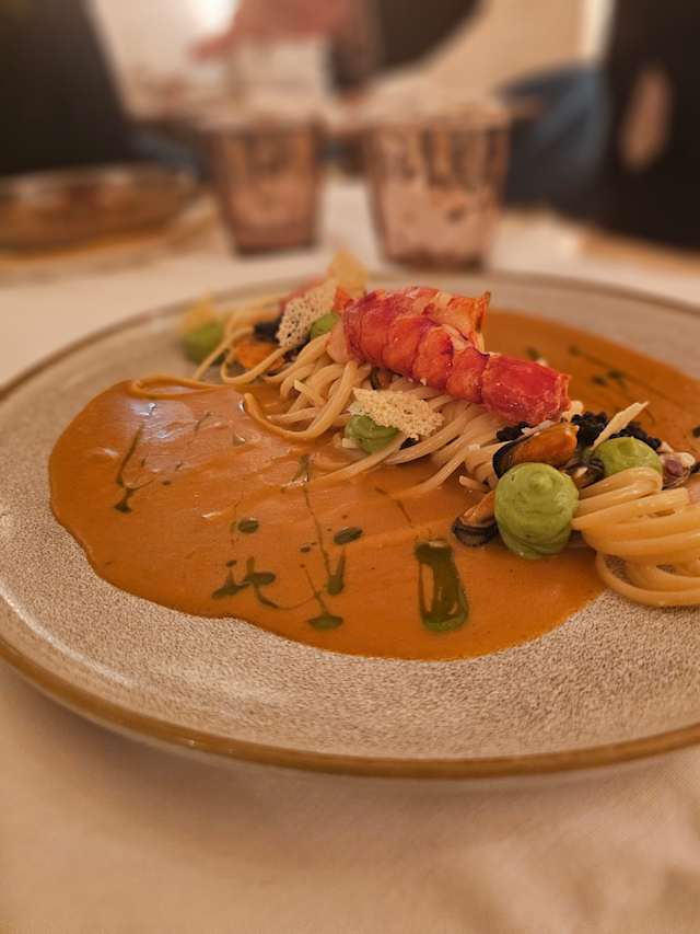 - Linguini, molho de camarão, carabineiro, bivalves, abacate, cebola crocante e ikura