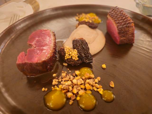 - Smoked duck magret, roasted chestnut purée, toasted chestnut crumble, orange gel, morel mushrooms, pickled mustard seeds, and duck jus