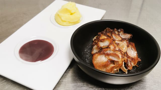 Coscia d’anatra confit all’arancia con carote in purea e prugne secche in tartare