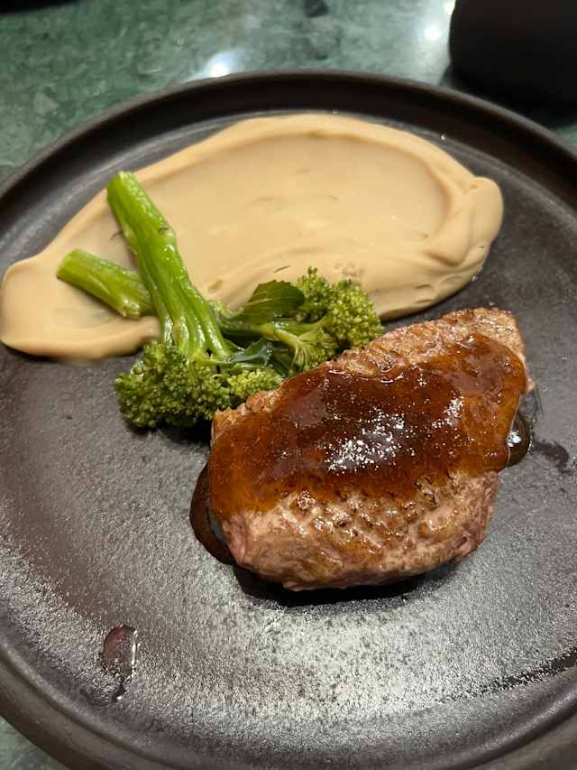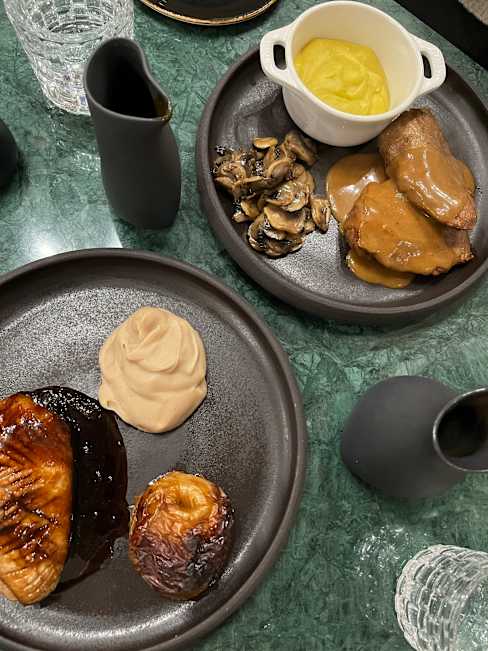 Naco da vazia com legumes, puré de batata e molho foie gras