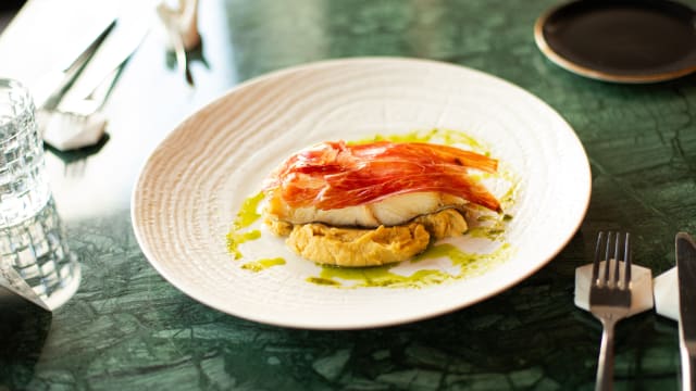 Lombo de bacalhau da islândia com puré de chouriço e gelado defumado