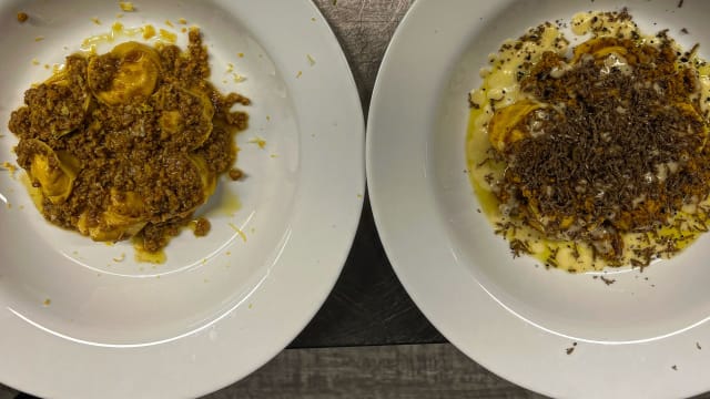 Con fonduta di parmigiano reggiano e crostone di pane tostato nel guanciale e tartufo fresco aquilano