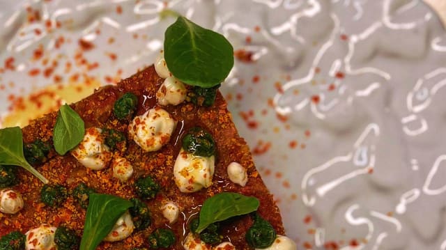 Marinato nelle erbe di montagna, avvolto nel guanciale e vellutata di ceci e zafferano