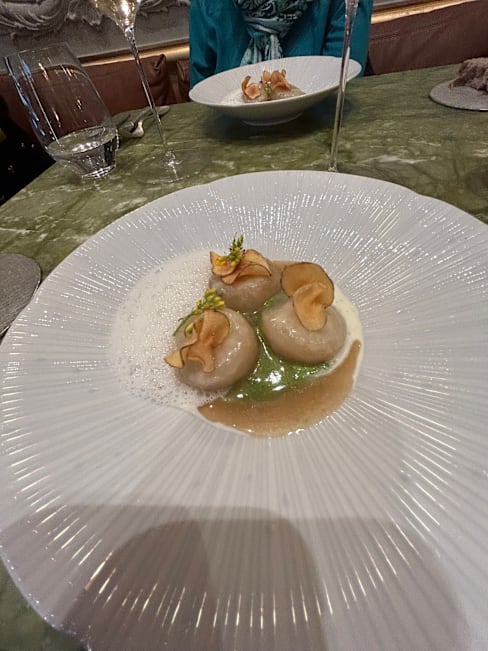 8/10The restaurant is lovely and charming. The set menu didn't live up to the E250 per person price point; for example, two of the courses repeated similar ingredients and similar appearance. The meat course was pheasant in pastry.... we would have expected that in a country inn, but not a one Michelin star restaurant. The sommelier was delightful.... absolutely lovely. However, we were surprised when he asked if we "wanted our wine glasses changed". There was no sense at all that it was New Year's Eve - no decorations, no sense of excited. The restaurant was absolutely empty by 11.30pm which we found very odd.