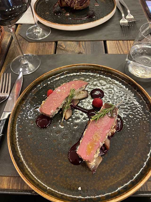 - Carpaccio di petto d'oca affumicato con mango e peperoncino