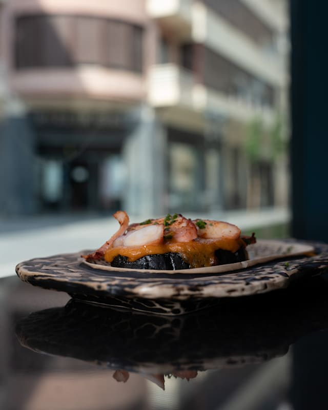 Tosta de pan de tinta con pulpo a la gallega y parmentier de la vera