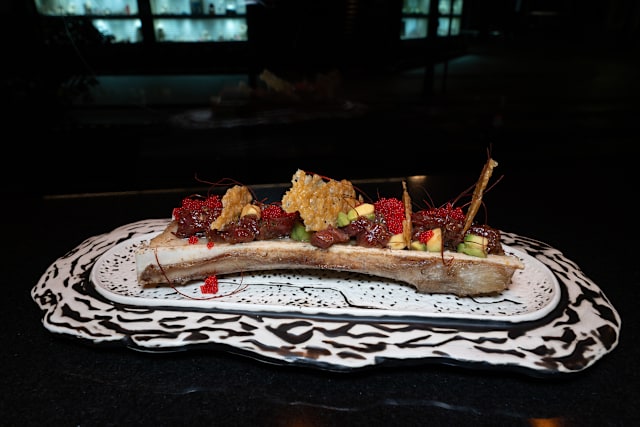 Tartar de atún rojo balfegó sobre tuétano asado y crujiente de parmesano
