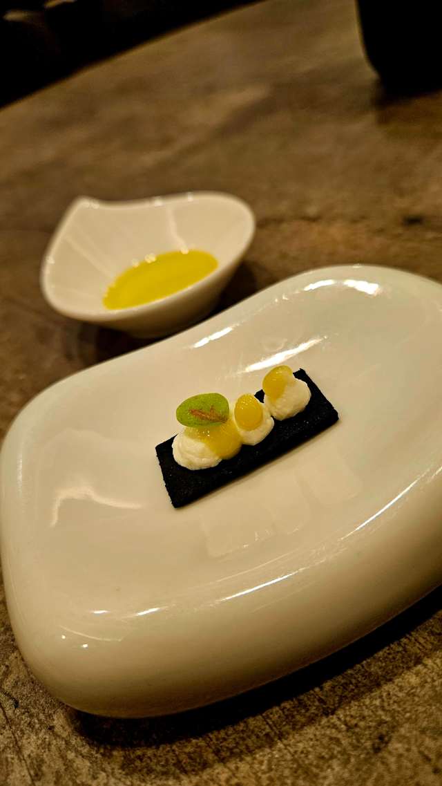 - Tartelletta di polenta taragna, sedano rapa, formaggio fresco e peproni verdi