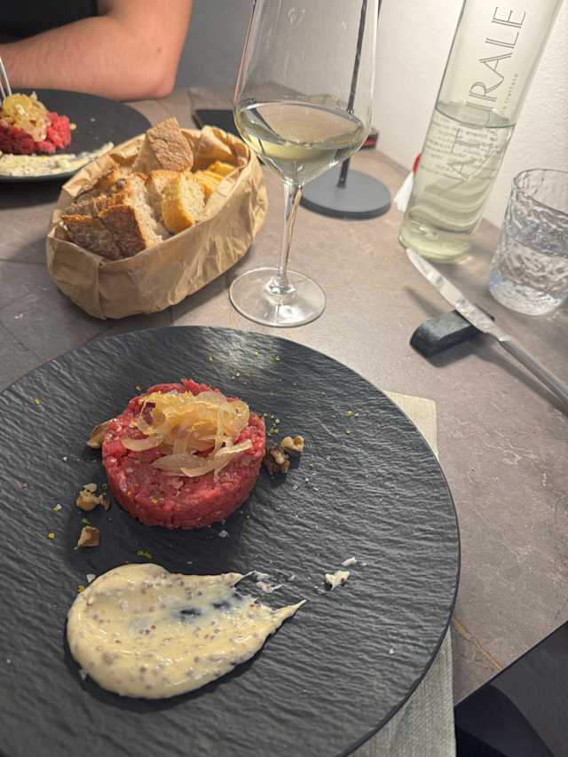 - Battuta di manzo al coltello con cipolla caramellata, noci, tuorlo d'uovo marinato e maionese alla senape