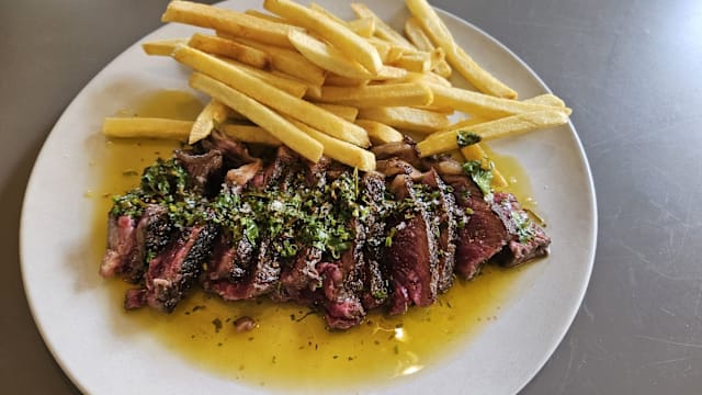 Bife da vazia (250g) com molho chimichurri, acompanhado de batata frita