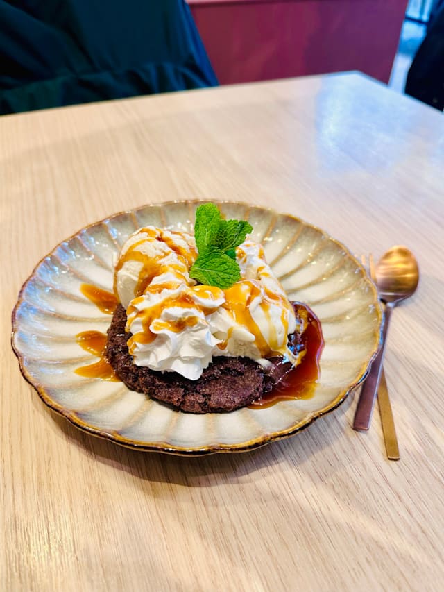 Warme chocolate chip cookie met vanille ijs, slagroom, gezouten caramel en pecan noten