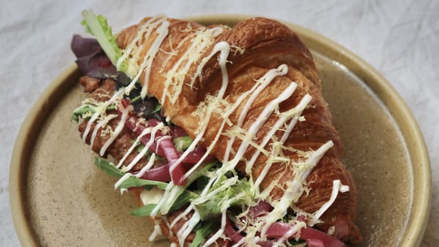 Avocado slices, gepofte paprika, komkommer, mesclun op een versgebakken croissant met pompoenpitten en een basilicum dressing