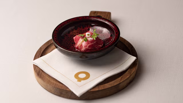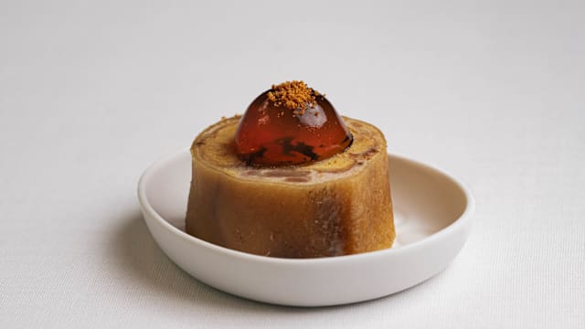 - Marrow of cured Iberian Ham with Osetra Caviar Geleé of 5 Jotas Acorn-fed Iberian Ham cane and sea urchin yolks