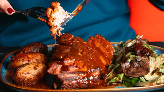 Effiloché d’agneau des alpes cuit 7h, crème d’ail confite maison & tomates séchées.