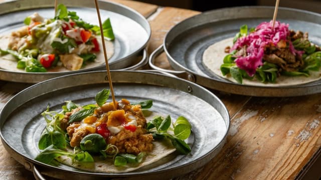 valeriana, pollo tinga, cavolo bianco e salsa yogurt