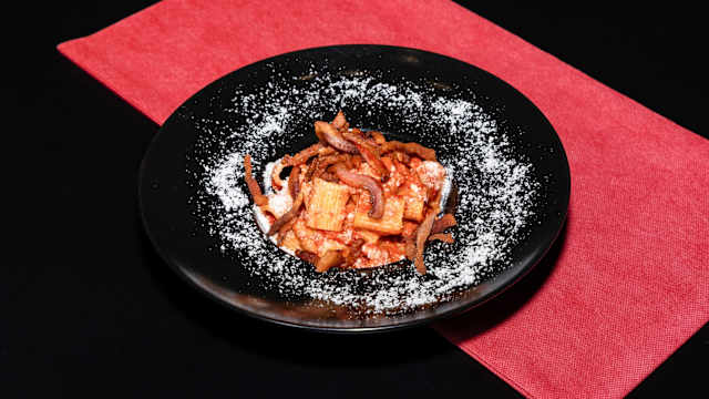 - Pasta con sugo di pomodoro, guanciale croccante e pecorino romano.