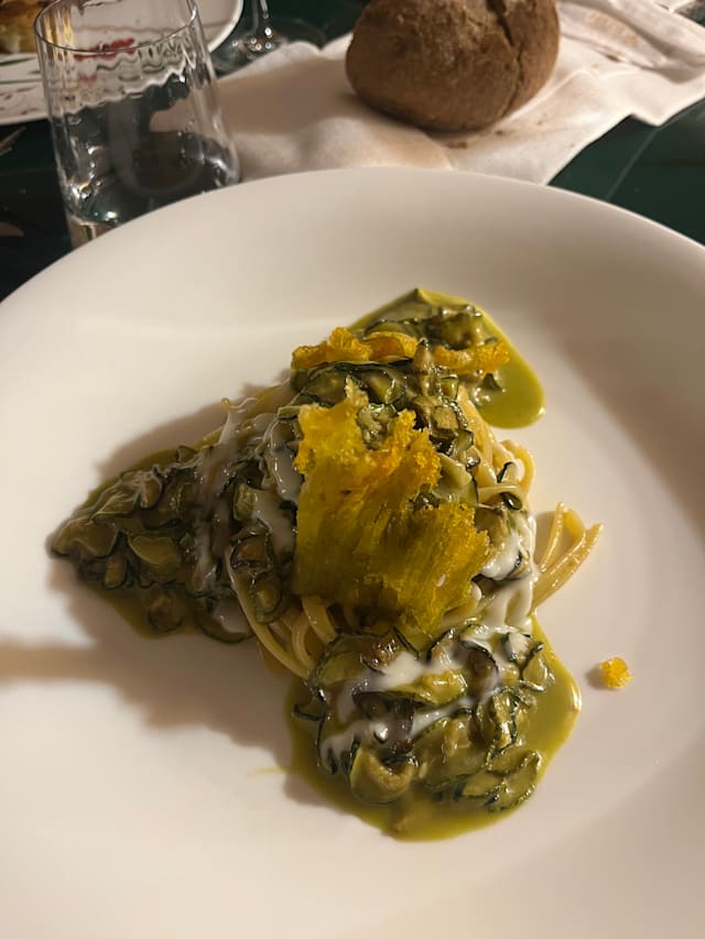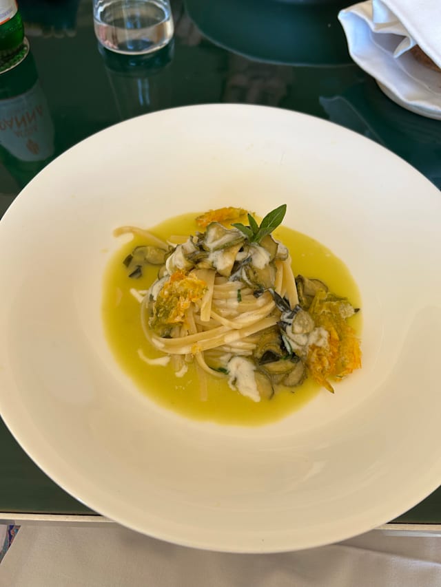 Linguina alla nerano, zucchine san pasquale, cristallo del suo fiore e provolone del monaco DOP