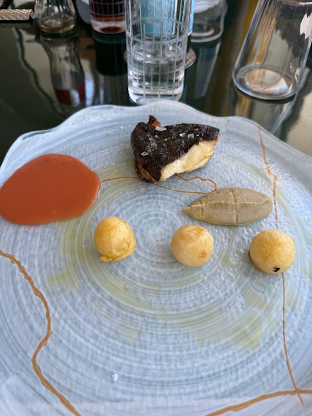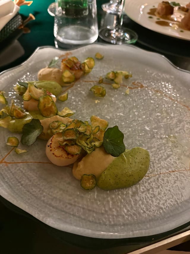 - Capesanta laccata in salsa agrodolce, cremoso di mandorle e zucchine in doppia consistenza
