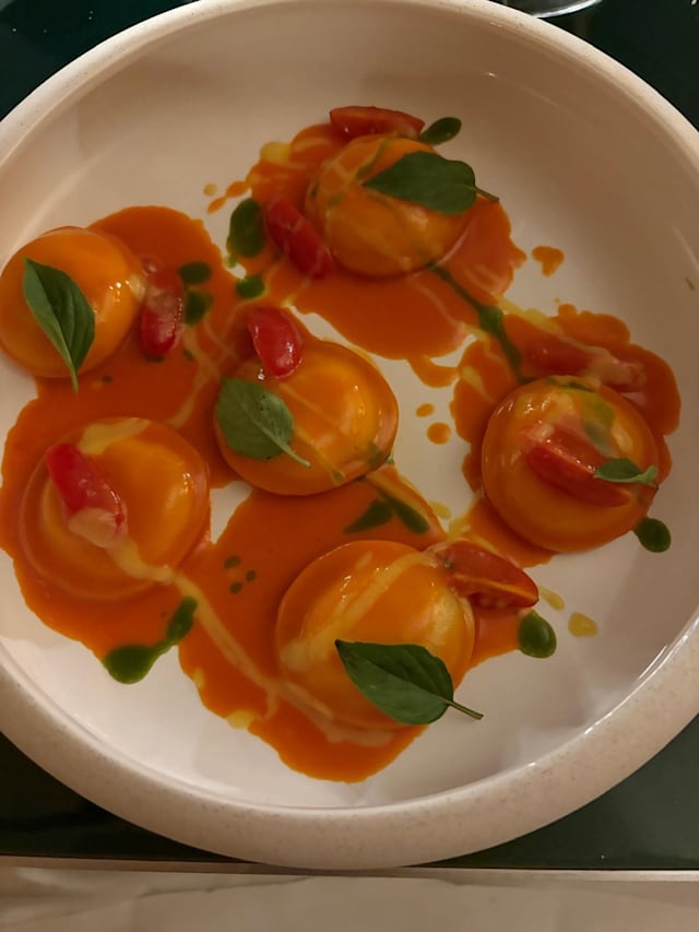 - Tartare di manzo alla bella donna, tre consistenze di pomodoro, maionese di capperi di salina, e cialda soffiata di olive nere di gaeta