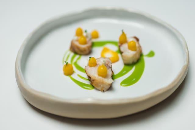 Ricciola con emulsione di prezzemolo, nage e crudo di funghi