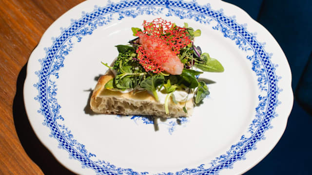 Stracciata di bufala, misticanza di campo, tartar di gamberi rossi, zest di limone della costiera amalfitana, chips di corallo, olio evo dop colline salernitane (barone).