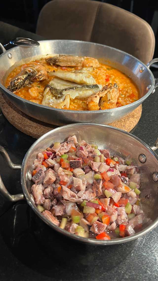 - Arroz carolino ensopado com camarões, pimentos e peixe grelhado