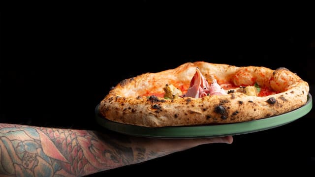 Pomodoro san marzano, fiordilatte, spalla cotta di san secondo, funghi cardoncelli, carciofi di pantelleria, terra di olive nere e olive di cerignola, olio evo "era"