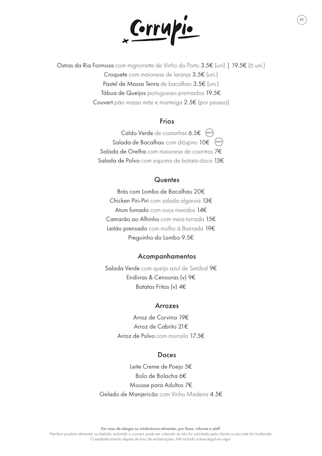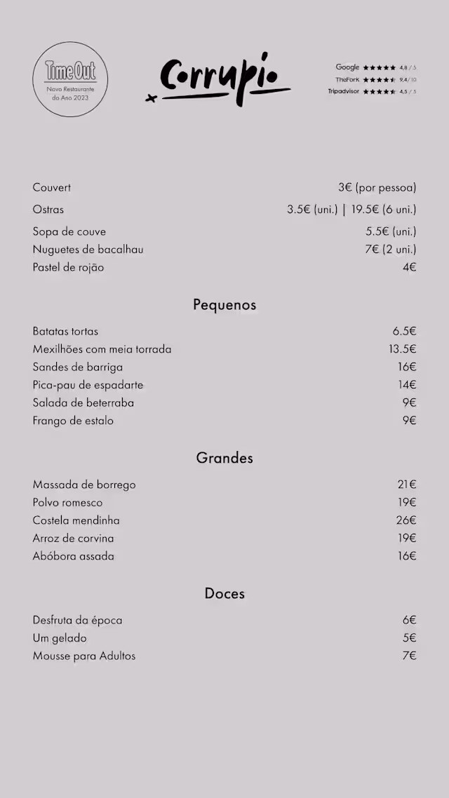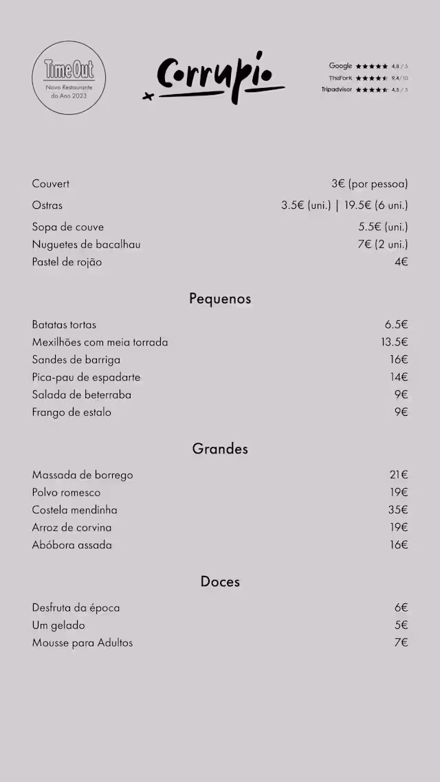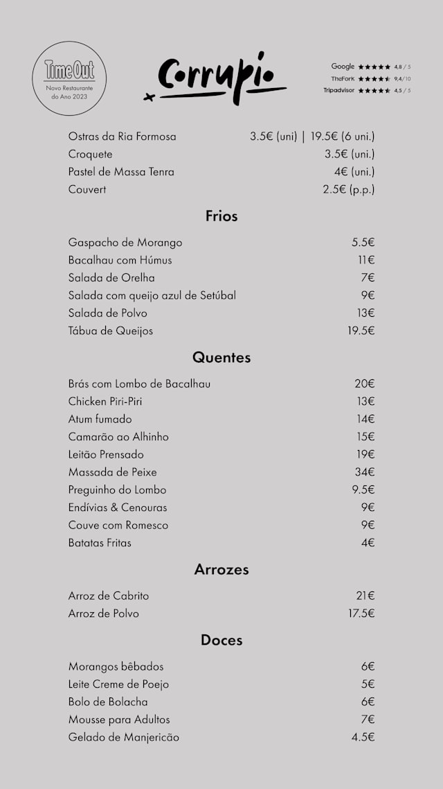 9.5/10The food was top notch. Every dish was delicious. The staff was fantastic - even though we were at a table the service was great. I come to Corrupio every time I’m in Lisboa.